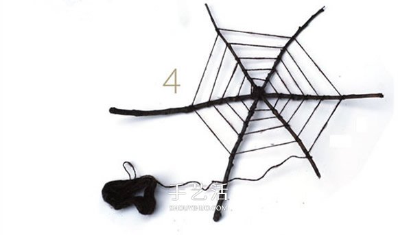 用棉线缠绕树枝,直到缠绕至最外圈,做出蜘蛛网。