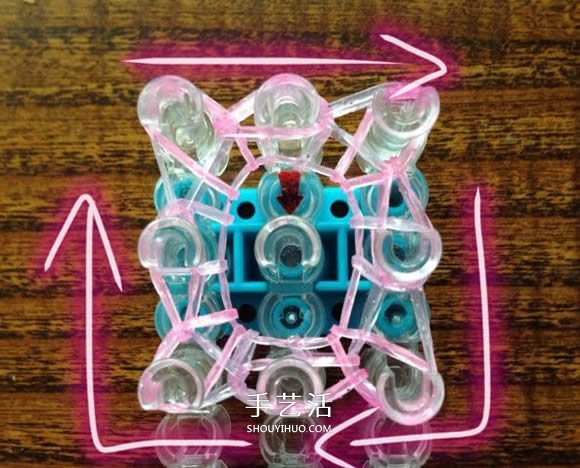 把橡皮筋像上图那样套到编织架上。