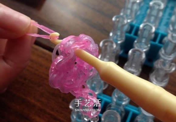 穿过皮筋,找到底部皮筋,再勾到左边。