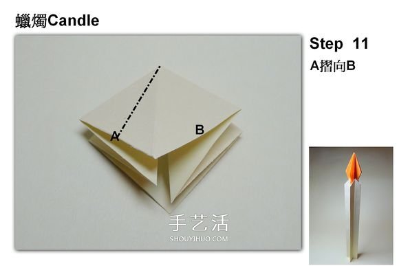 接着取一张正方形的黄色纸,开始折烛火部分。