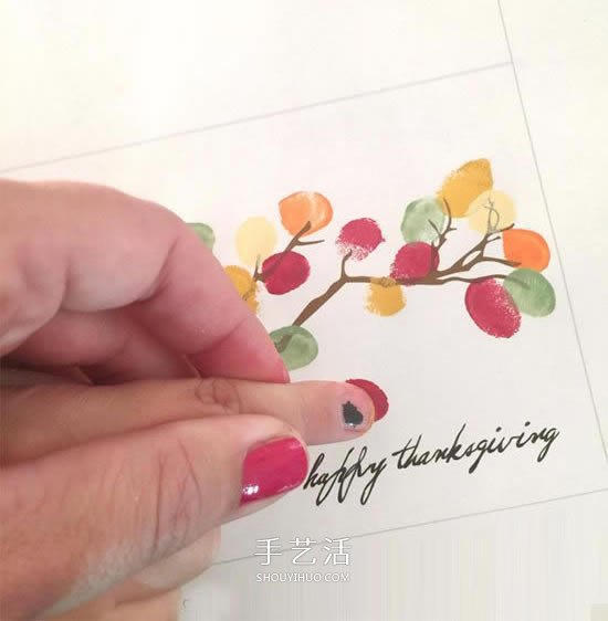 调好颜料,然后手指蘸颜料在树枝上印出指印,作为树枝上的叶子。