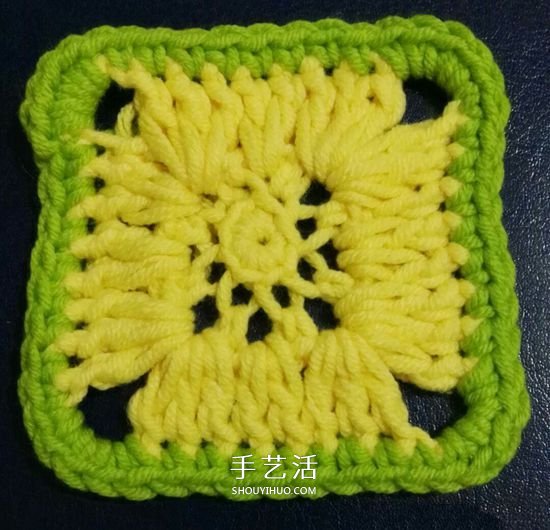 8、第七圈,在第五圈内侧挑半针勾织。蓝色花忘记拍了,补个黄色花的。