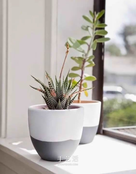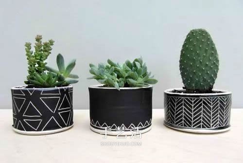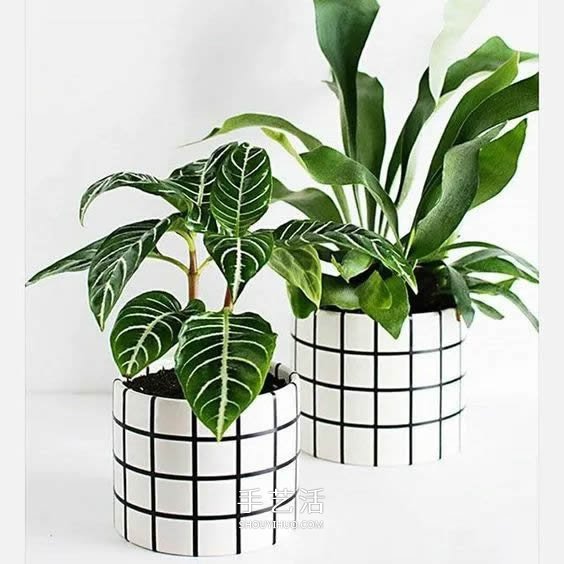 巧妙的贴上胶带纸,就能让花盆颜色分层,或直线或斜线,小技巧有大功用。