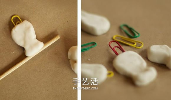 取白色的超轻粘土,捏出大致的小鱼形状,再把回形针从小鱼头部插进去,记得要留一小半在外面。