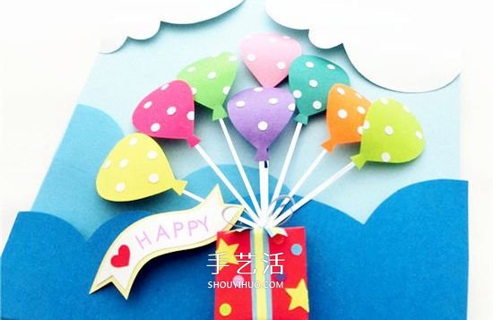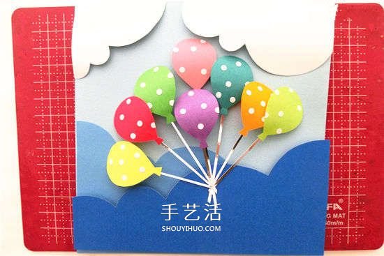 用白色、蓝色和深蓝色卡纸做出蓝天白云的背景卡片,将气球先贴上去做出如图造型。