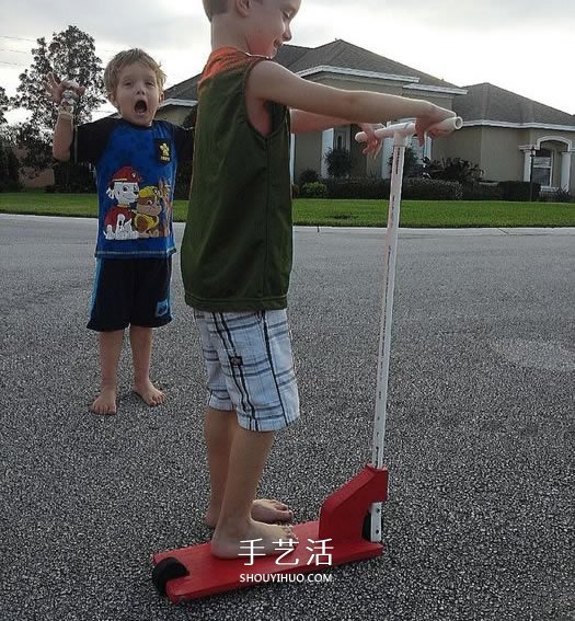 现在木制的滑板车这孩子做完成了,让你的孩子来试试吧~