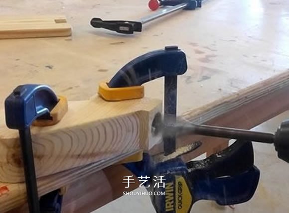 在手柄支架上有一个小矩形,这个矩形是安装把手的地方。使用两个扳机夹,将手柄支架平放到工作台上(确保手柄支架的顶部指向你)。使用铅笔标记矩形顶部中心的位置,然后使用7/8钻头钻一个孔。