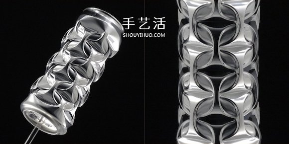 他用手指头和指甲边在原本平坦的圆柱罐表面,压出错综复杂的几何图形,规律而对称的美感,让人忘了这其实本该是随手可丢的废弃物。