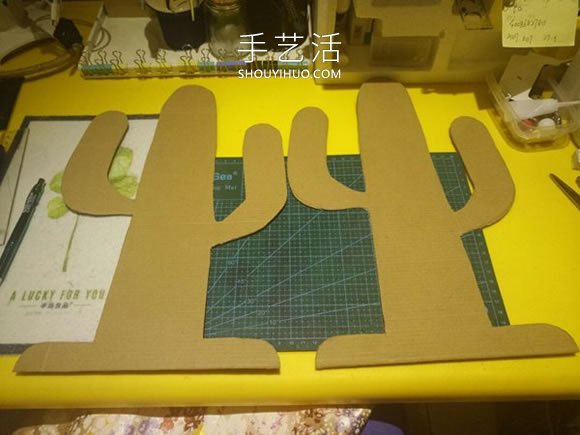 2.把两块硬纸板合在一起,画出仙人掌,并切割下来。