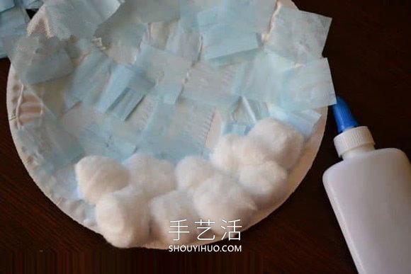 2.然后把棉花团粘贴到纸盘的下部,完成后如图。