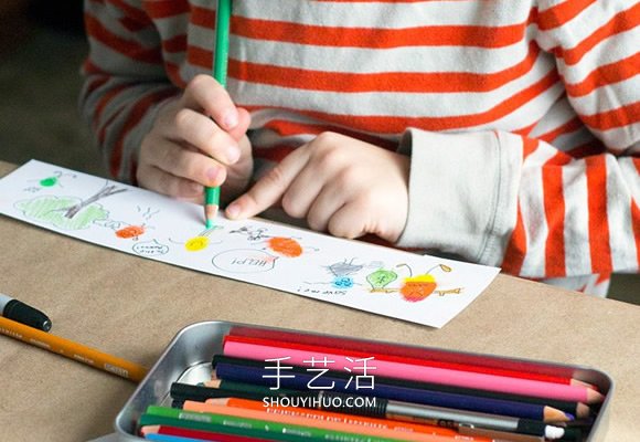 1.我们将白色卡纸切成条来开始这项艺术活动。让孩子将指尖按在印泥上并将其压印在纸上来创建有趣的角色 。再使用马克笔和彩色铅笔添加细节!