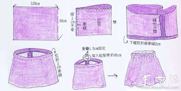 5)腰头穿入松紧带,松紧带末端重叠1.5厘米缝合,完成短裙制作。