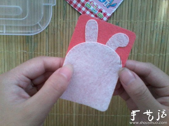 大白胖兔子的脑袋缝好了,再给它穿上系上暖暖的围巾吧。接下来要做的就是把卡套的背面和正面缝合起来,这里采用的针法是毛边缝。