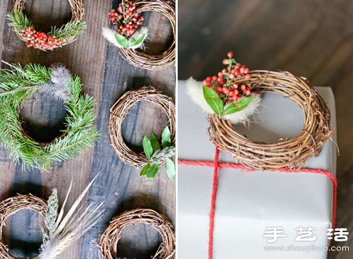 漂亮的装饰能给礼物包装加分不少,就比如今天介绍的这款清新自然的藤条花环装饰,让人期待盒子里的礼物,但又不忍心破坏它的美丽。制作方法也非常简单,用藤条缠绕出圆圈,将长满红色野果的植物搭配稻谷、羽毛等随意插入花环中,一个漂亮的包装装饰花环就DIY完成了。