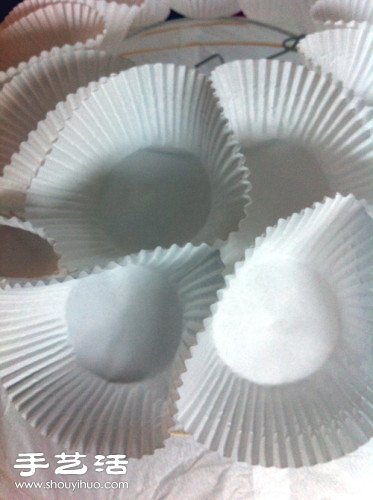 让杯形蛋糕衬里圆形式绕着灯笼粘牢直到灯笼的四分之三。然后把灯笼翻过来,轻轻地放回碗里,原来上面的那端朝下。