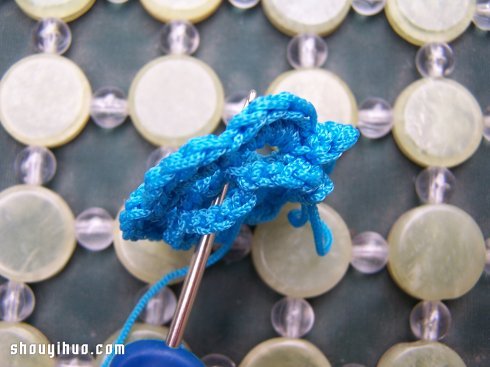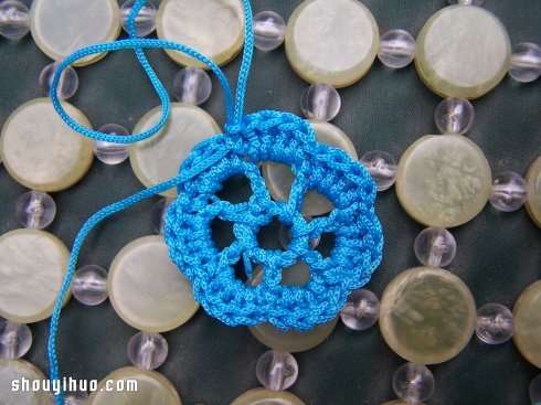 接下来重复3针小辫1针长针,最后形成由7个小孔组成的花心。