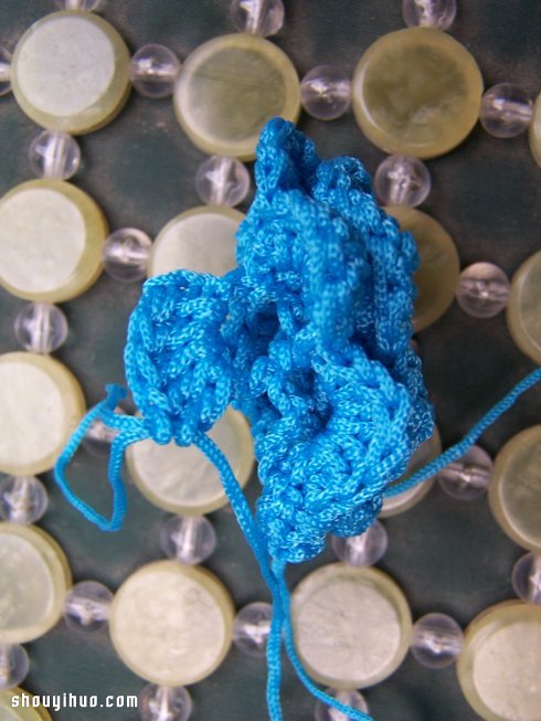 钩第7行,钩3针小辫,10针长针(连小辫),7针绕短针,5针短针到头。