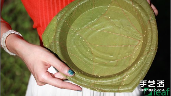 叶片餐盘共有三层,上下两层是以棕榈叶纤维缝制成的大张树叶,中间则是用树叶做成的纸,这三层上机台以热压成型之后,就成了我们熟悉的一次性使用餐盘,唯一的差别就在于,它只要28天就可以自然分解了!